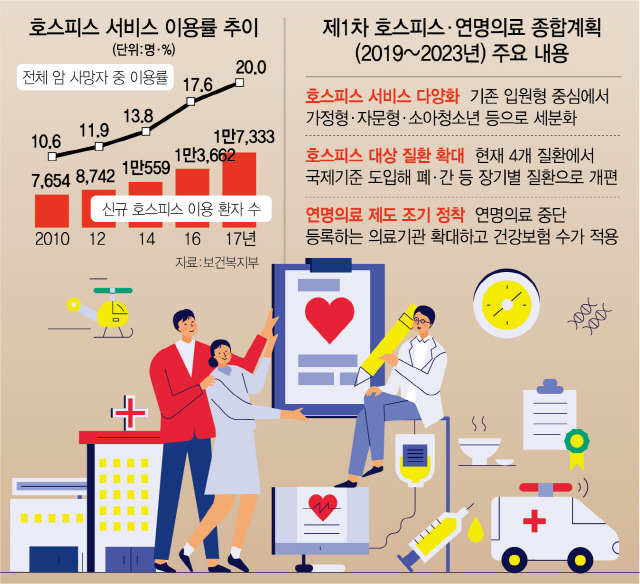이 이미지에서 보듯이, 2010년부터 2017년까지의 서비스 이용률이 지속적으로 증가했으며, 이는 호스피스의 필요성을 더욱 부각하고 있어요.